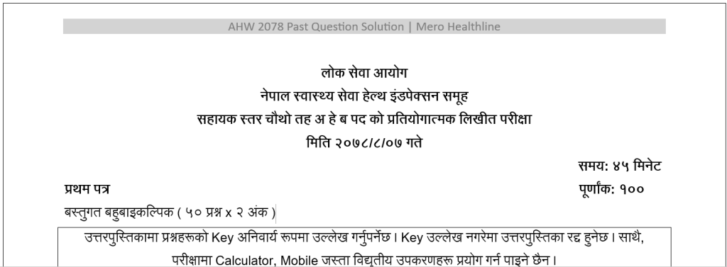 उत्तरपुस्तिकामा प्रश्नहरूको Key अनिवार्य रूपमा उल्लेख गर्नुपर्नेछ । Key उल्लेख नगरेमा उत्तरपुस्तिका रद्द हुनेछ । साथै, परीक्षामा Calculator, Mobile जस्ता विद्युतीय उपकरणहरू प्रयोग गर्न पाइने छैन ।