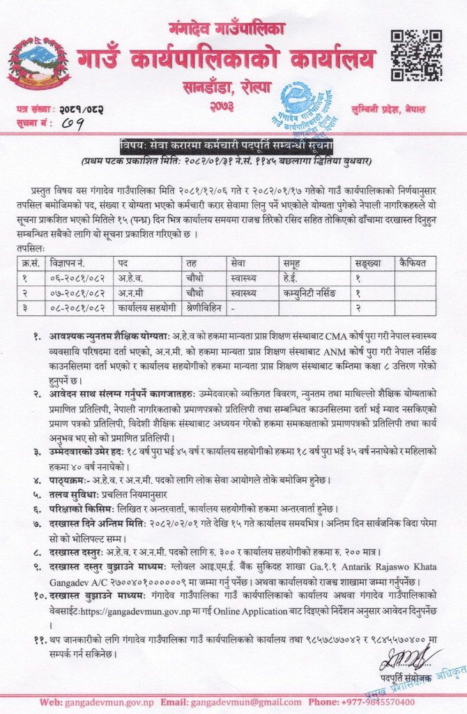 Applications are invited from eligible Nepali citizens for the following vacant positions in Gangadev Municipality on a service contract basis, as per the decision of the Gangadev Municipality Executive on 2082/03/06. Interested candidates who meet the minimum qualifications must apply within 15 days from the date of this notice (i.e., by 2082/03/20, June 3, 2025) during office hours.