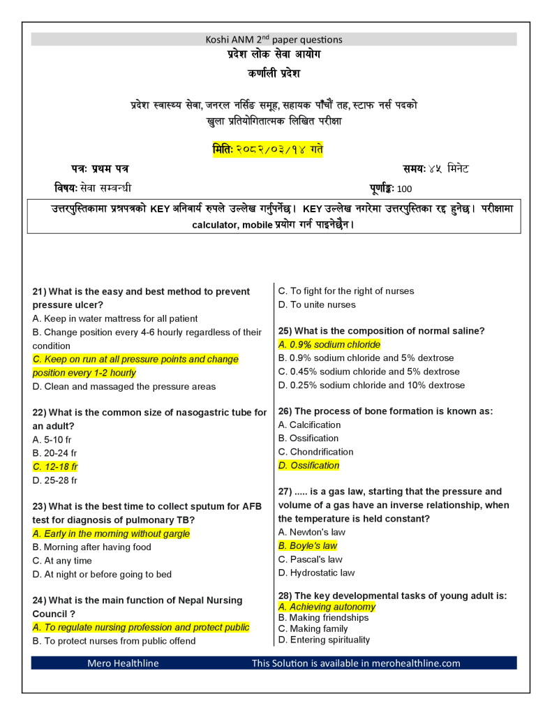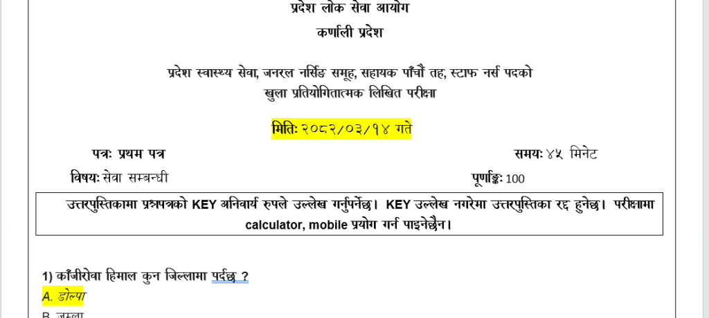 उत्तरपुस्तिकामा प्रश्नपत्रको KEY अनिवार्य रुपले उल्लेख गर्नुपर्नेछ। KEY उल्लेख नगरेमा उत्तरपुस्तिका रद्द हुनेछ। परीक्षामा calculator, mobile प्रयोग गर्न पाइनेछैन।