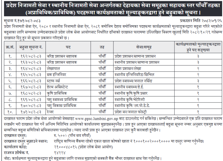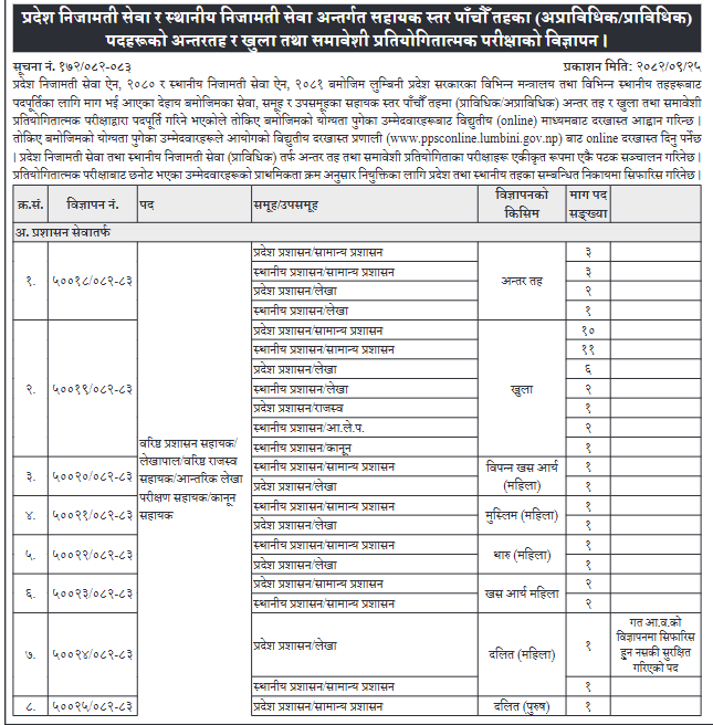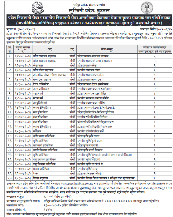 लुम्बिनी प्रदेश लोक सेवा आयोगले प्रदेश निजामती तथा स्थानीय निजामती सेवाका विभिन्न पदहरूमा ठूलो संख्यामा विज्ञापन प्रकाशित गरेको छ।