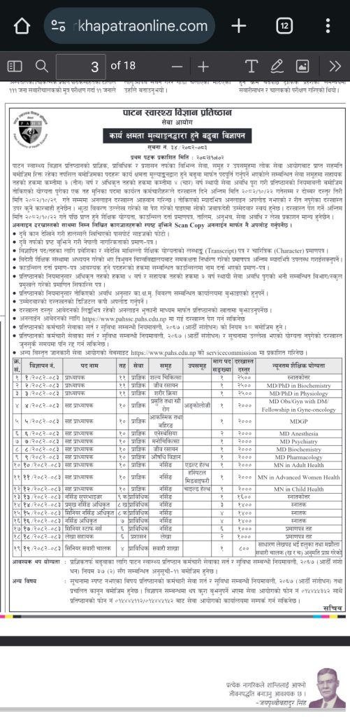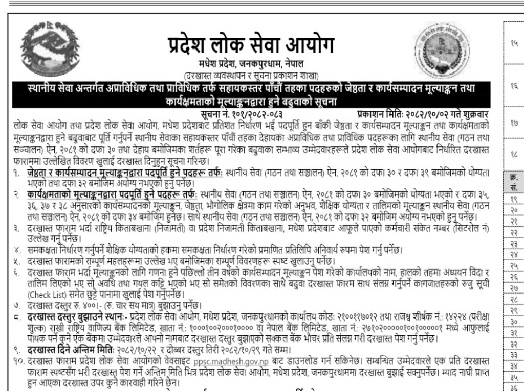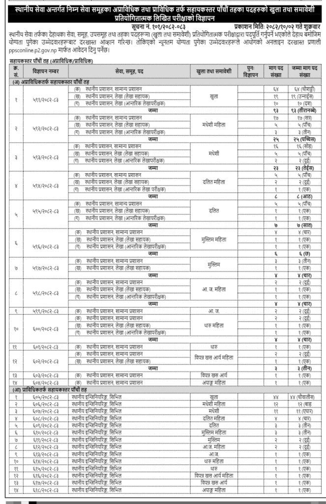 मधेश प्रदेश लोक सेवा आयोगले स्थानीय सेवा अन्तर्गत पाँचौ तह (प्राविधिक/अप्राविधिक) मा ठूलो संख्यामा विज्ञापन गरेको छ ।स्वास्थ्य सेवा तर्फ