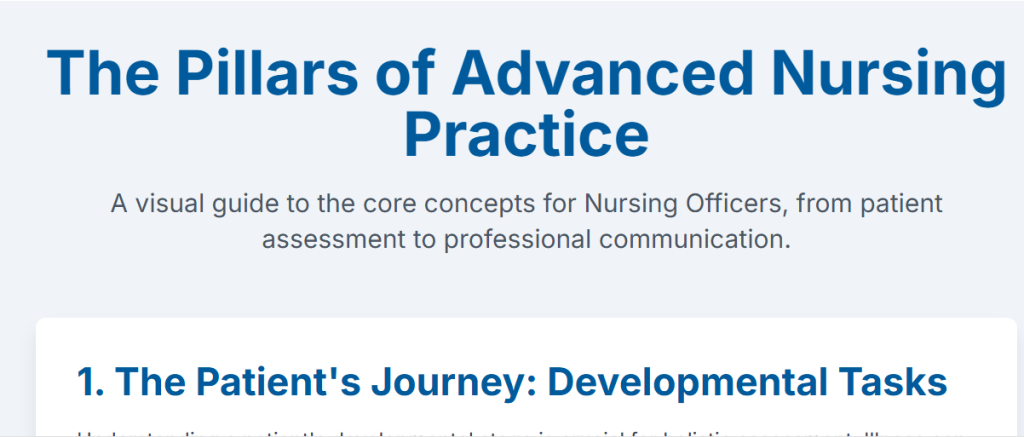 A visual guide to the core concepts for Nursing Officers, from patient assessment to professional communication.