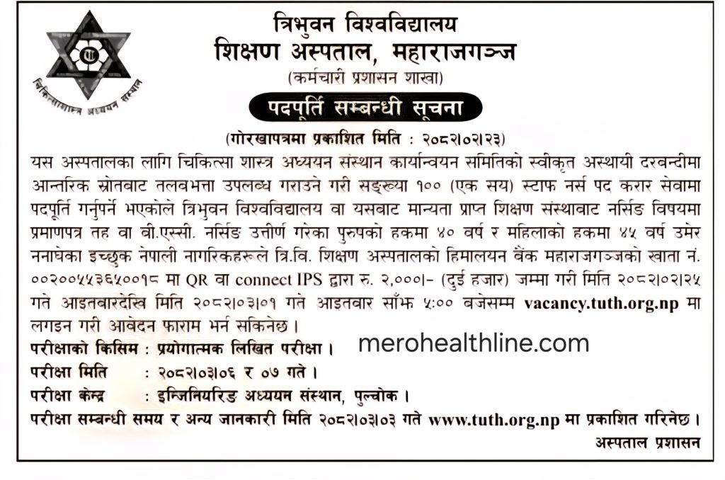 Job Vacancy Announcement – Tribhuvan University Teaching Hospital, MaharajgunjPublished on: 2081/02/23Application Deadline: 2081/03/07 (Till 5:00 PM)Tribhuvan University Teaching Hospital (TUTH), Maharajgunj, under the Employee Administration Branch, invites applications from qualified Nepali citizens for the post of Staff Nurse (Contract Service).🧾 Vacancy Details:Position: Staff NurseNumber of Vacancies: 100 (One Hundred)Service Type: ContractEducational Qualification: Must have completed PCL Nursing or B.Sc. Nursing from Tribhuvan University or any other recognized institution.Age Limit:Male: Should not exceed 40 yearsFemale: Should not exceed 45 years💵 Application Fee: Rs. 2,000Deposit the fee at Himalayan Bank, Maharajgunj BranchAccount Number: 00200105250016(Use QR or Connect IPS for payment)🖊️ How to Apply:Submit your online application form at https://vacancy.tuth.org.np by the deadline.📝 Selection Process:Exam Type: Practical and Written ExamExam Date: 2081/03/09Exam Center: Institute of Engineering, Pulchowk📌 Note: Detailed exam schedule and additional information will be published on 2081/03/03 at www.tuth.org.np.