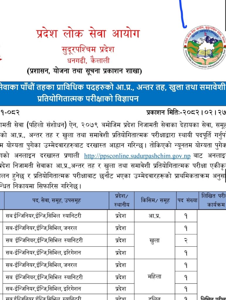 https://ppsconline.sudurpashchim.gov.np📄 Full Notice & Syllabus: https://psc.sudurpashchim.gov.np📌 Available Positions:A. Promotion via Seniority and Performance Evaluation:Sub-Engineer – General (Civil Engineering)Sub-Engineer – SanitarySub-Engineer – IrrigationRanger – ForestryPublic Health NurseComputer OperatorB. Promotion via Competency Evaluation:Sub-Engineer – GeneralSub-Engineer – Sanitary (2 posts)Sub-Engineer – IrrigationHorticulture AssistantLivestock AssistantRanger – ForestryPublic Health NurseKabiraj – AyurvedaLab Technician – MedicalComputer OperatorC. Open & Inclusive Competitive Exams:Sub-Engineer (General, Sanitary, Irrigation)Agriculture and Horticulture TechniciansFishery and Livestock TechniciansRanger and Soil Conservation AssistantStaff Nurse and Public Health NurseKabiraj, Lab Technician, Pharmacist SupervisorComputer Operator (Various categories)📚 Minimum Qualification (Example):Sub-Engineer (Civil/Sanitary/Irrigation): Diploma in Civil Engineering or relevant equivalent.Ranger: Diploma in Forestry or relevant field.Staff Nurse: PCL in Nursing from a recognized institution.Computer Operator: Proficiency Certificate with 6 months computer training or equivalent.📑 Required Documents:Citizenship CertificateAcademic CertificatesEquivalency (if studied abroad)Inclusive Category Proof (if applicable)Recent Passport-size Photo & Signature (in JPG format)🔎 Important Notes:Exams will be held in Dhangadhi, Kailali.Medium: Nepali/English or both.The exam includes written, practical, and interview stages.All applicants must ensure correct and complete application submission within the deadline.📞 For Further Inquiries: 091-527600📩 Email: ppsc.p7@gmail.com🌐 Website: https://psc.sudurpashchim.gov.np