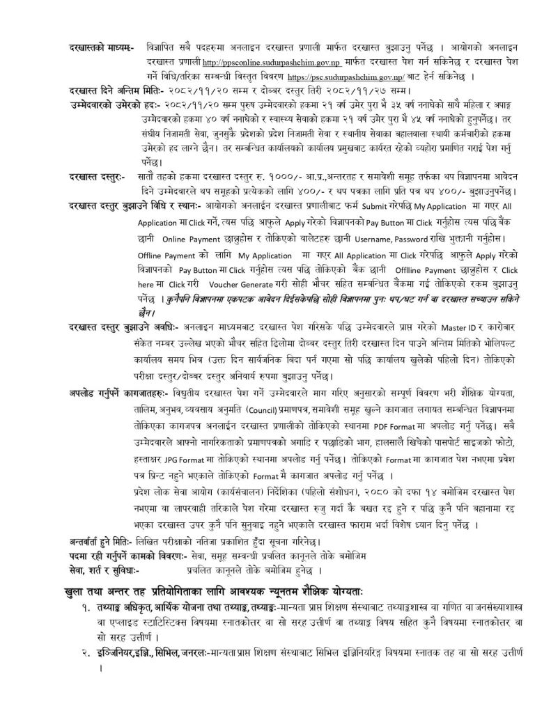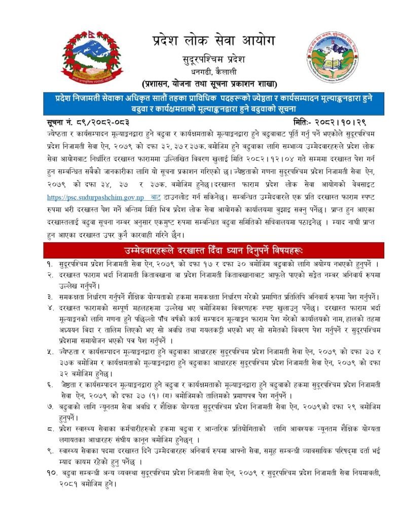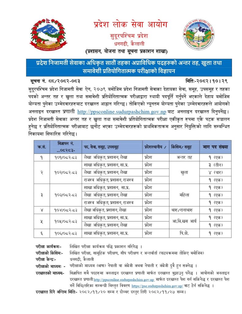 सु.प. प्रदेश निजामती सेवाका अधिकृत सातौं तहका प्राविधिक पदहरुको बढुवा, आ.प्र., अन्तर तह, खुला तथा समावेशी प्रतियोगितात्मक परीक्षाको विज्ञापन !