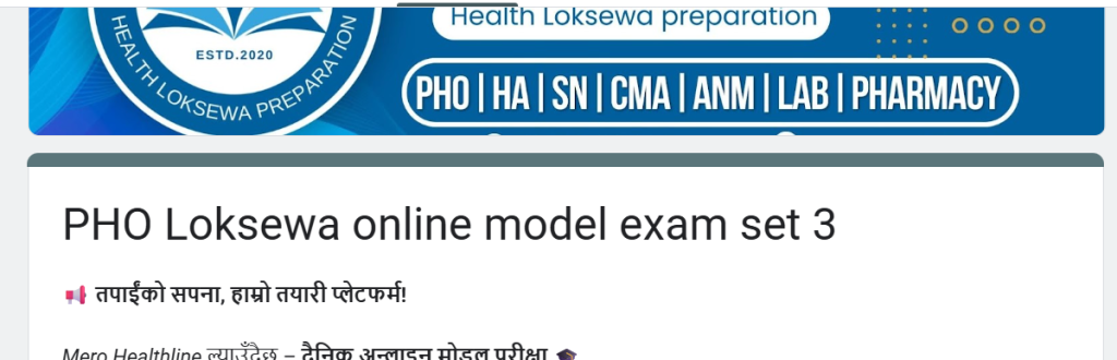 Public Health Officer (PHO) – Online Model Exam Conducted by Mero Healthline 🎯 लोकसेवा तयारी अब अझ सरल र प्रभावकारी!Mero Healthline ल्याउँदैछ Public Health Officer (PHO) Online Model Exam – Read More …