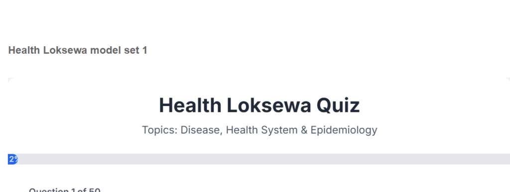 Health Loksewa Quiz Health Loksewa Quiz Topics: Disease, Health System & Epidemiology Loading question… Previous Next Submit Quiz Quiz Completed! Your score: 0 / 50 Review Your Answers Restart Quiz